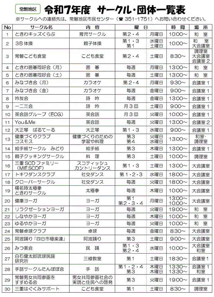 常磐地区ホームページトップ > サークル活動 > サークル団体一覧表